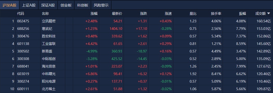 个股方面,立讯精密成交额超160亿元居首,寒武纪、胜宏科技、工业富联成交额靠前。